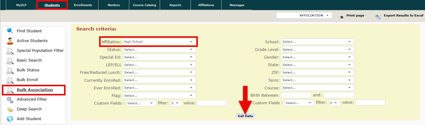 - To view all students within the selected affiliation, click the Get Data button.