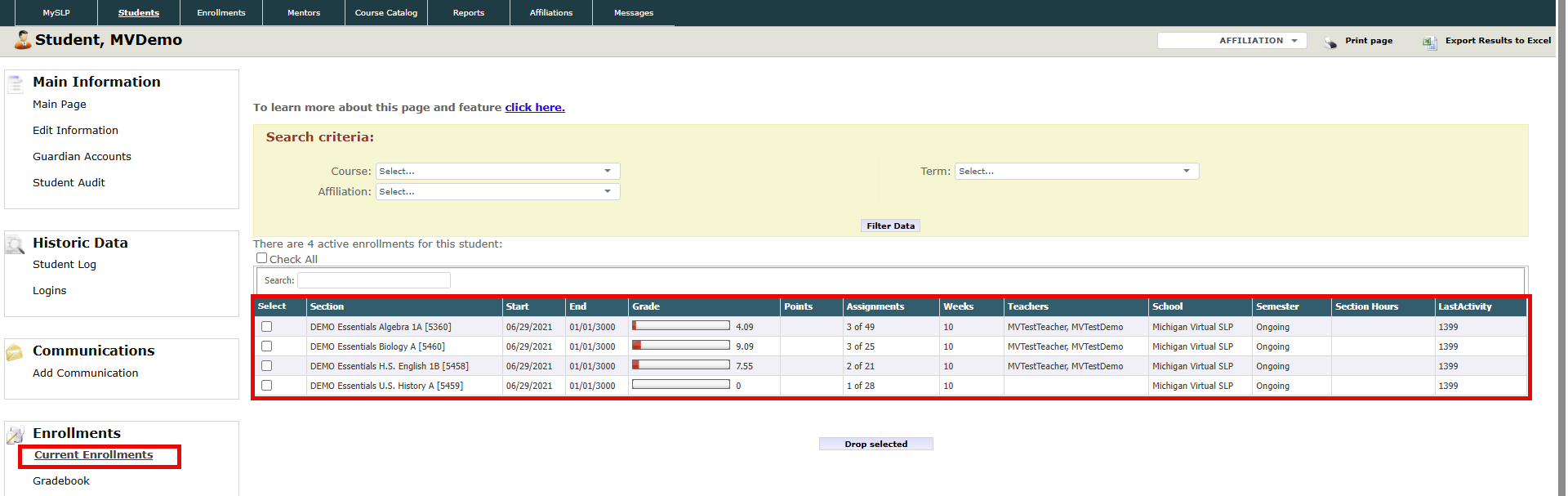 - On the left navigation menu of the student profile, scroll down and select Current Enrollments. A table will appear showing the student's active course enrollments.