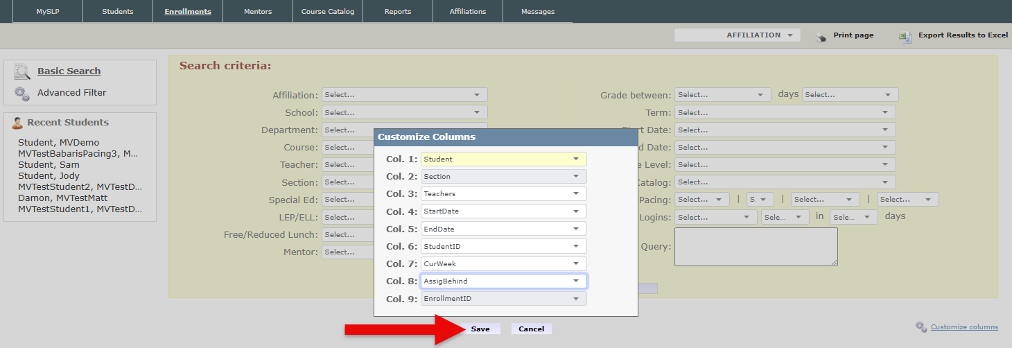Important: The Customize Columns feature is only available to mentors and affiliation users. Other account types do not have access to this feature.