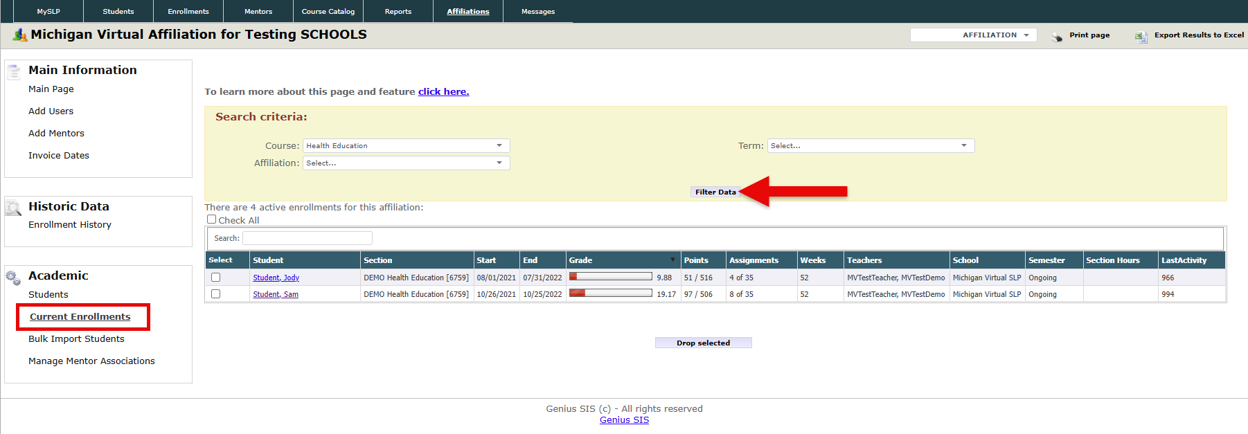 - Use the "Search Criteria" section and then tap the Filter Data button to find a specific enrollment. Any item displayed in the search results confirms a current and successful enrollment within the system.