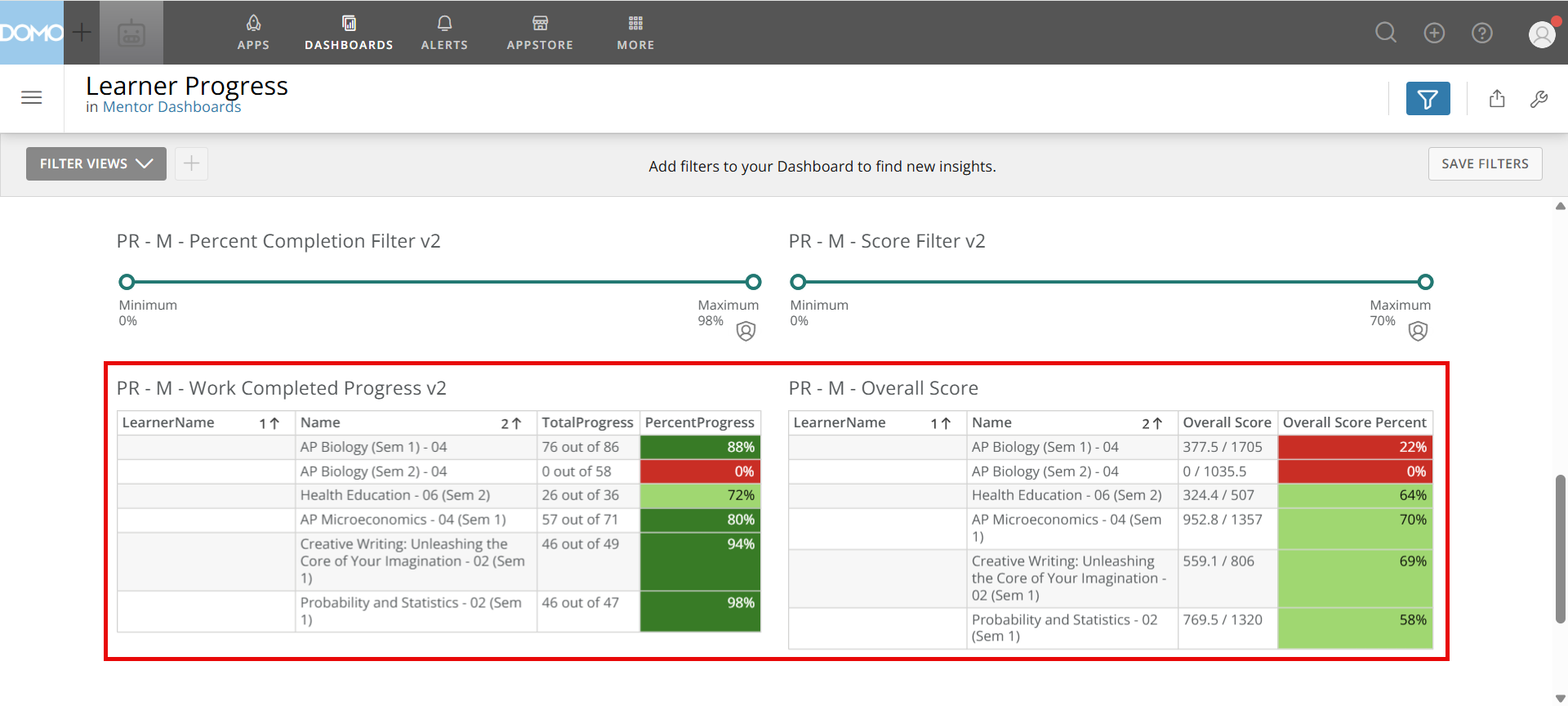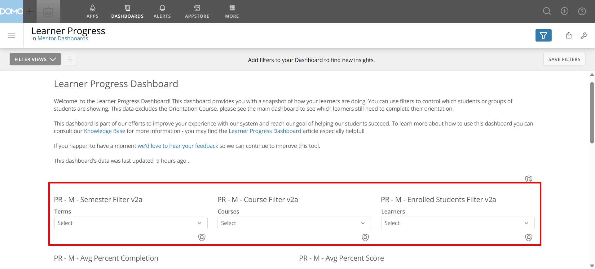 Mentors can apply filters to focus on specific semesters, courses, or students. Filtered results will be displayed in the following data cards: "PR - M - Avg Percent Completion" and "PR - M - Avg Percent Score."