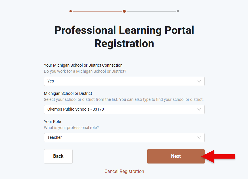 - Populate the drop-down fields to specify Your Michigan School or District Connection. When fields have been populated, tap the Next button.