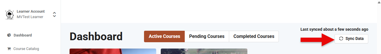 To perform a data sync with the LMS, click the “Sync Data” button located in the top-right corner of the page. The most recent sync time is also displayed. This feature helps ensure that course completions are updated and visible.