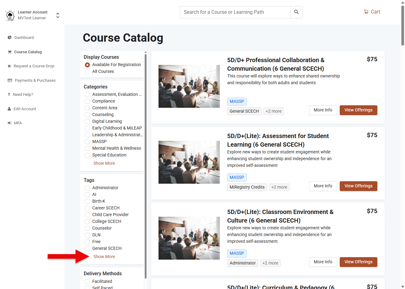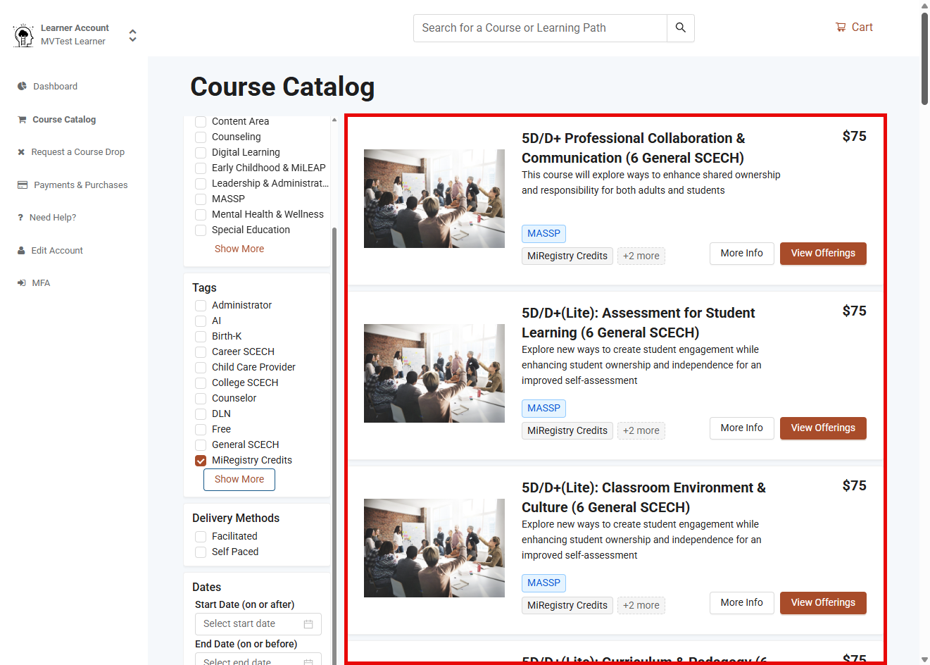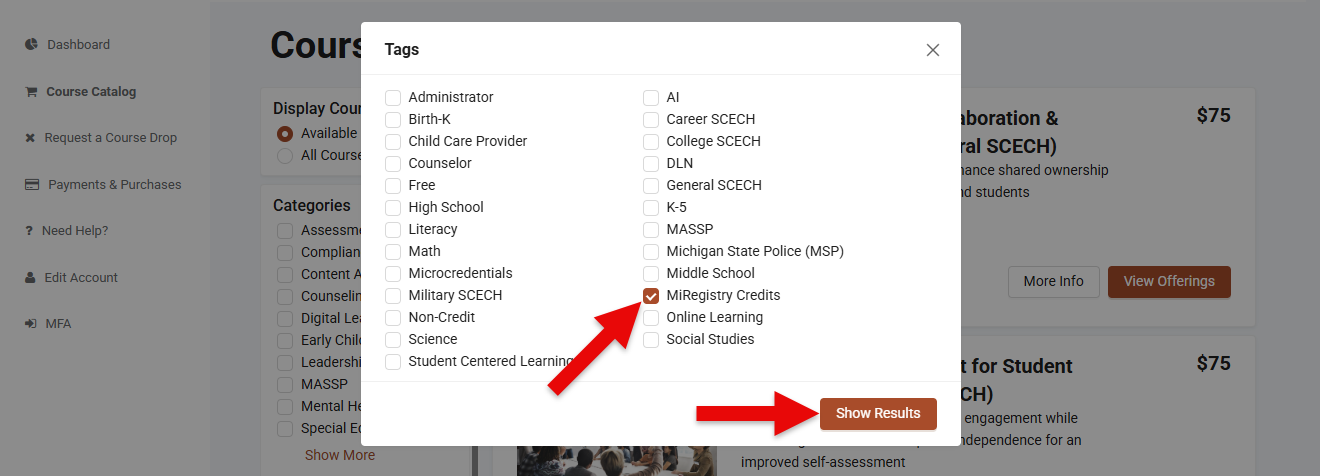 - The Course Catalog page will refresh displaying courses eligible for MiRegistry credit.