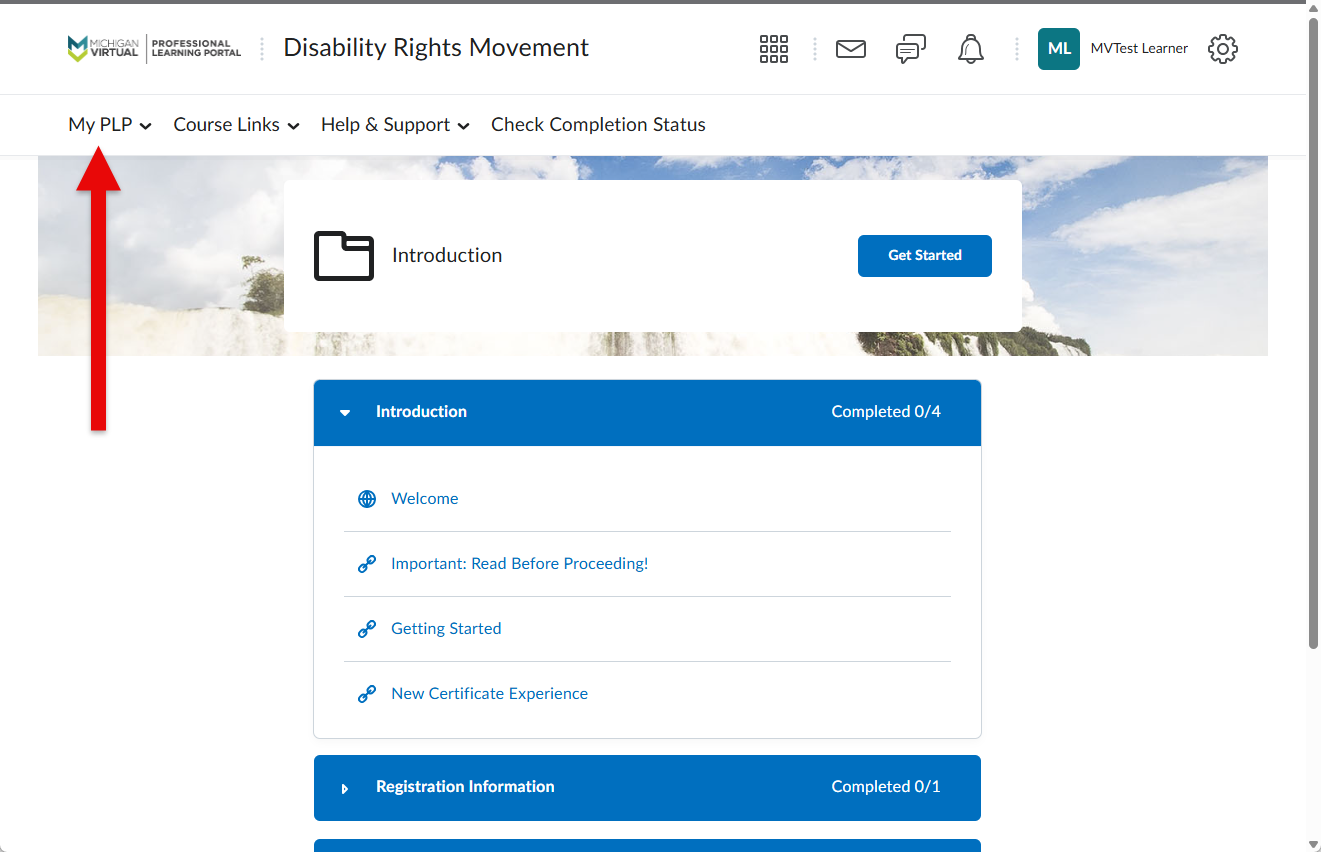 Brightspace courses will launch in a new browser tab. To the right of the Michigan Virtual Professional Learning Portal logo, learners will find the course title. Beneath this, navigation menus will be visible, including My PLP, Course Links, Help & Support, Check Completion Status, and Certificate. In the address bar of the new tab, learners will observe the term "lsp" displayed. You can refer to the image below for an illustrative example of a Brightspace course layout. Refer to Brightspace Navigation.