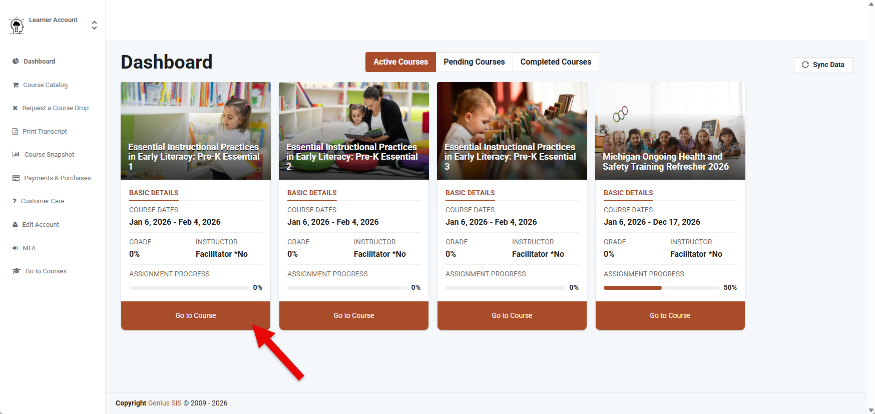 - By default, the Dashboard page will be displayed and the Active Courses tab will contain tiles with course titles. Select the Go to Course button to launch the course in a new browser tab.