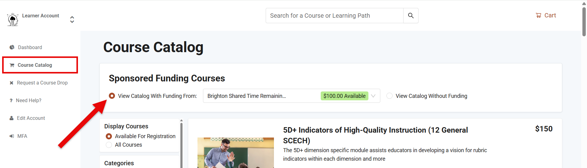 - First, select Course Catalog from the left navigation menu. By default, the "Sponsored Funding Courses" section will appear at the top of the Course Catalog with "View Catalog With Funding From" option selected.