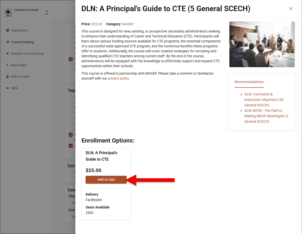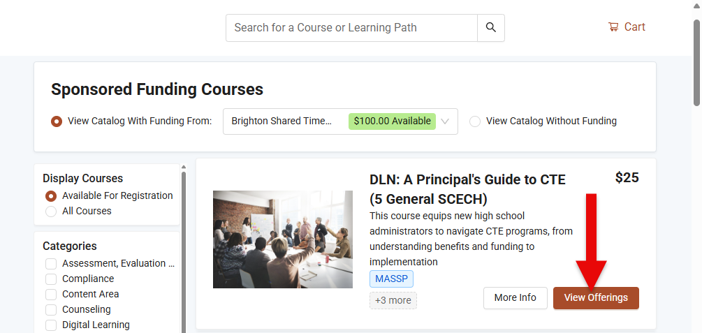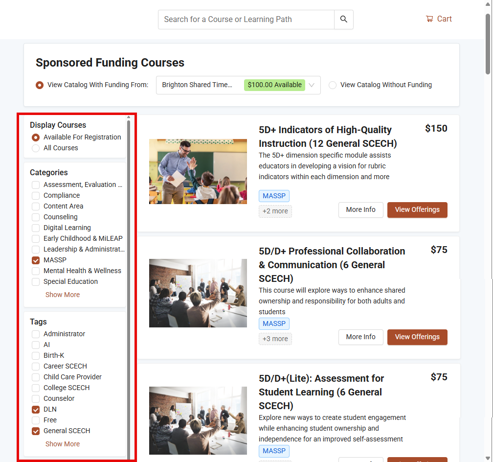 - With the above selected, learners will narrow displayed results using the filters to the left (i.e. Display Courses, Categories, etc.).