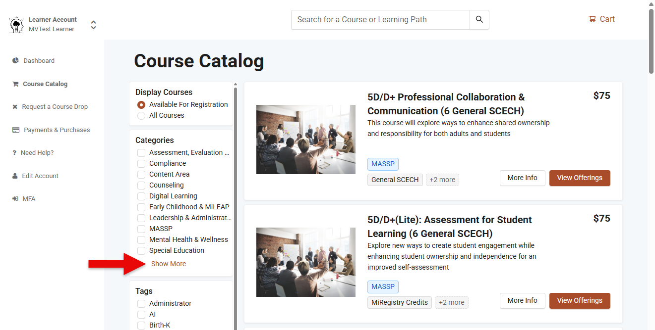 The PLP catalog is accessible to users whether they are logged into the platform or not. If a learner is not logged in, they can visit https://plp.michiganvirtual.org/ to explore the catalog. For logged-in users, they can select the "Register for course" option from the left menu. In both cases, learners can search for Path to Leadership (PTL) courses following the instructions below.