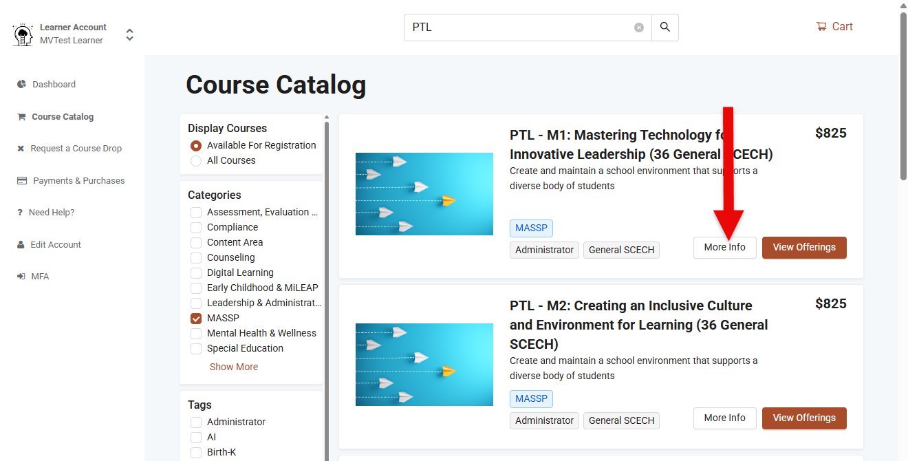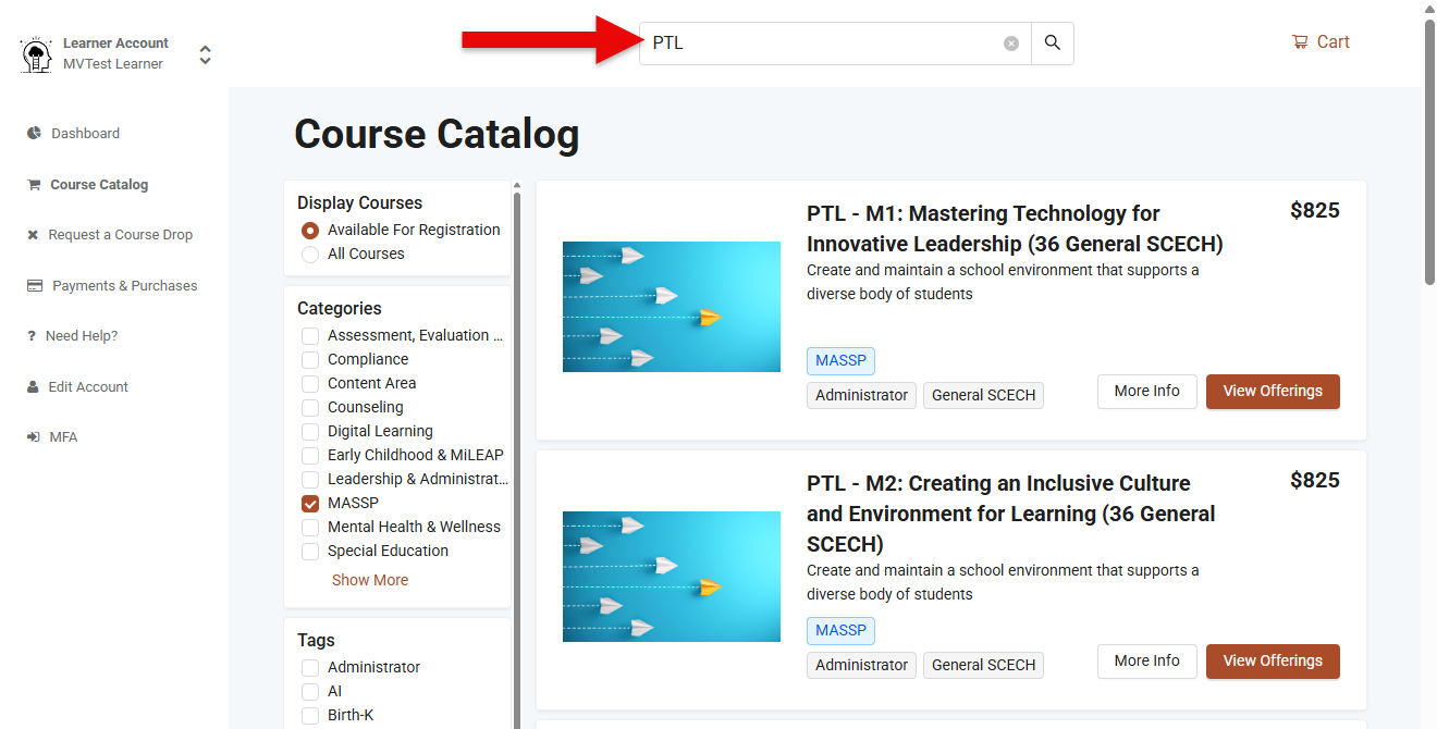 - The Course Catalog page will refresh displaying MASSP courses. At this point, type "PTL" in the Search bar.