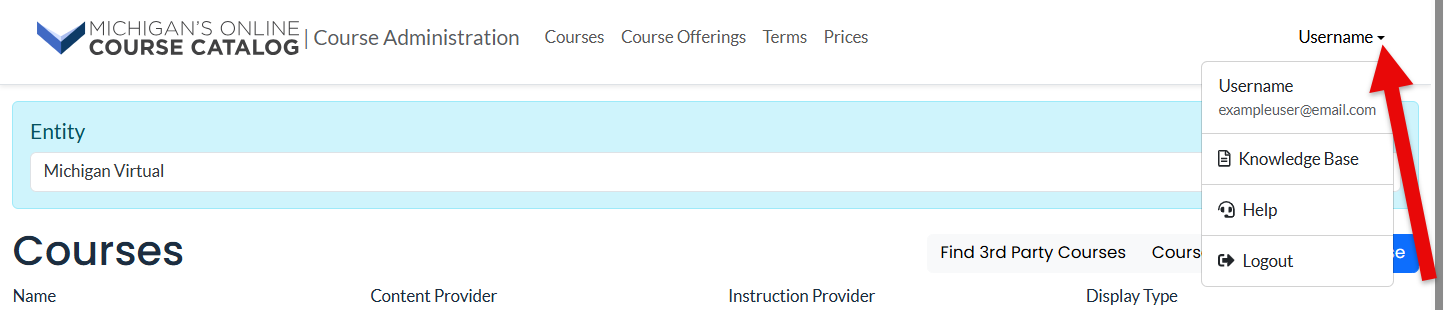 Change Description: The MiCourses Administration site was updated to include contextual help resources within the user profile drop-down menu.