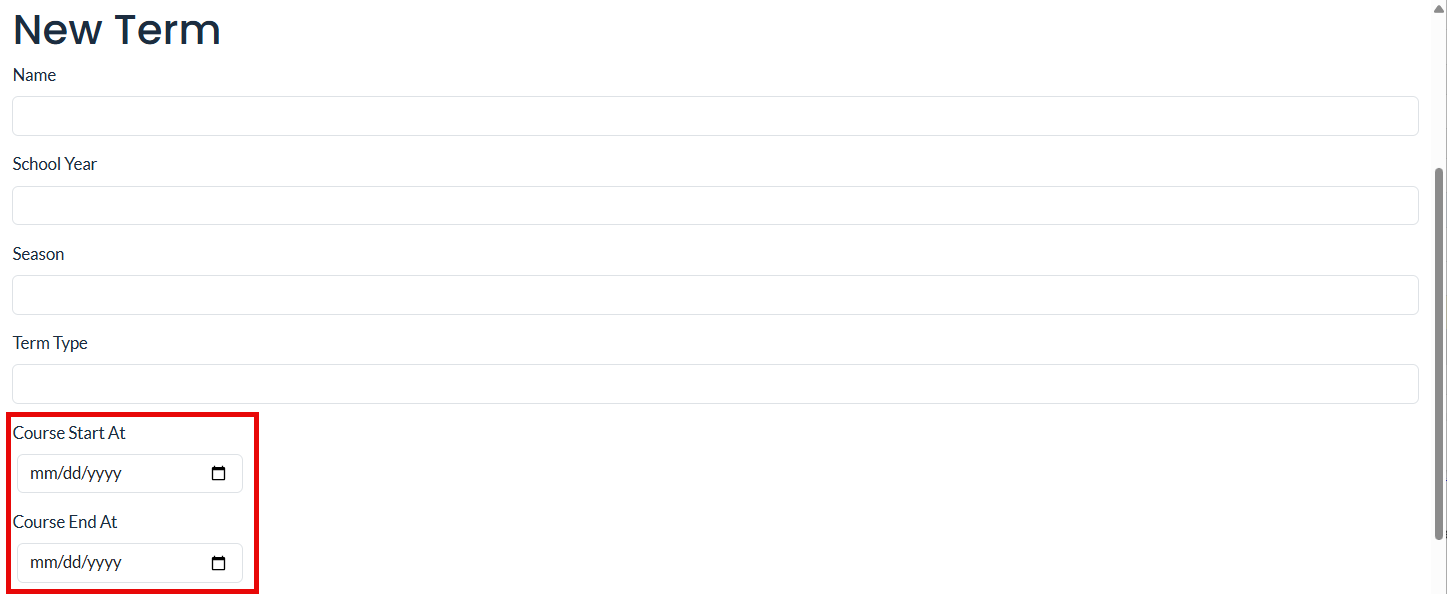 Change Description: The fields "School Year," "Season," and "Term Type" must now be filled out in order to save a new Term on the MiCourses Administration site.