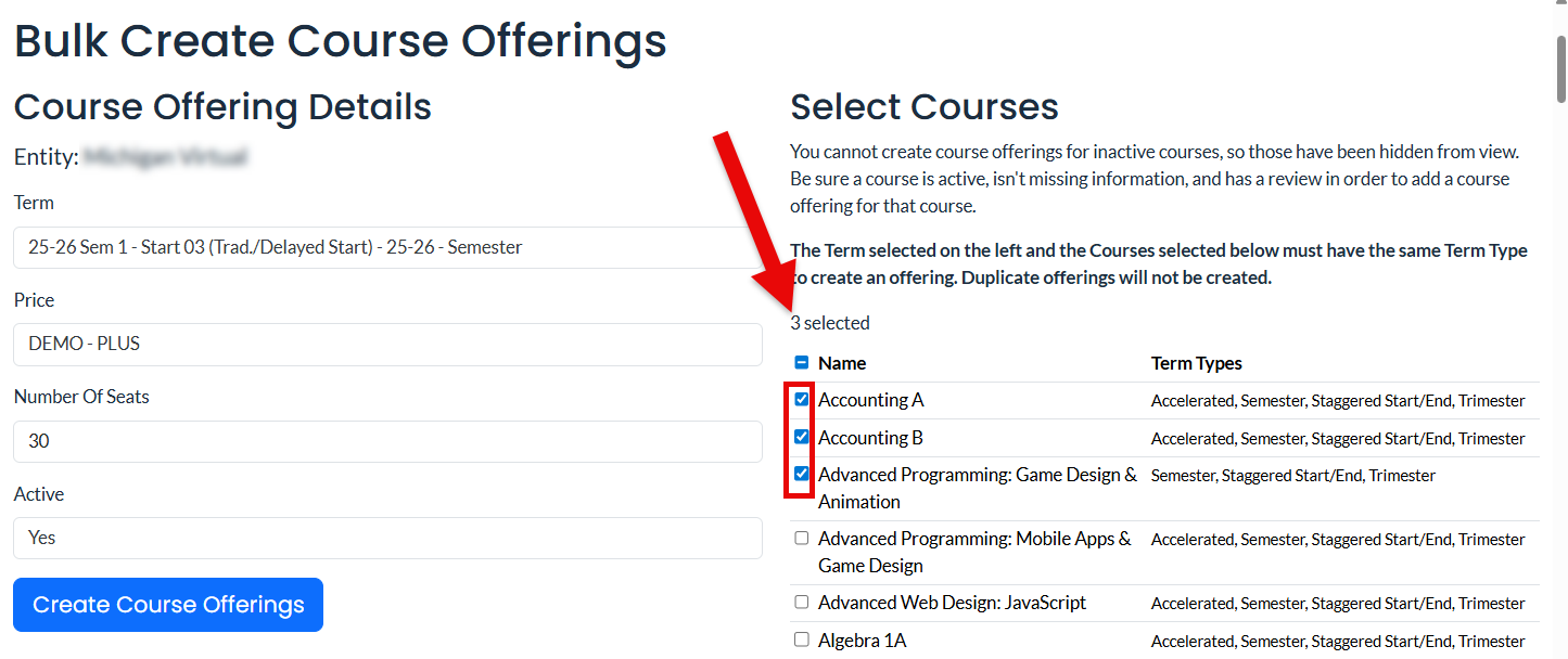 Reason for Change: This enhancement reduces confusion by allowing users to confirm the number of selected items before creating course offerings, which cannot be deleted from the system.