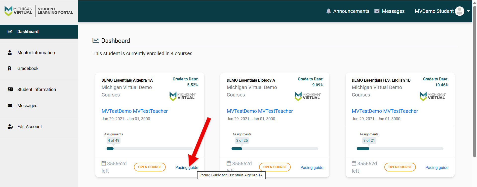 - Next, tap the "Pacing Guide" link located in the bottom right corner of the course tile as shown below.