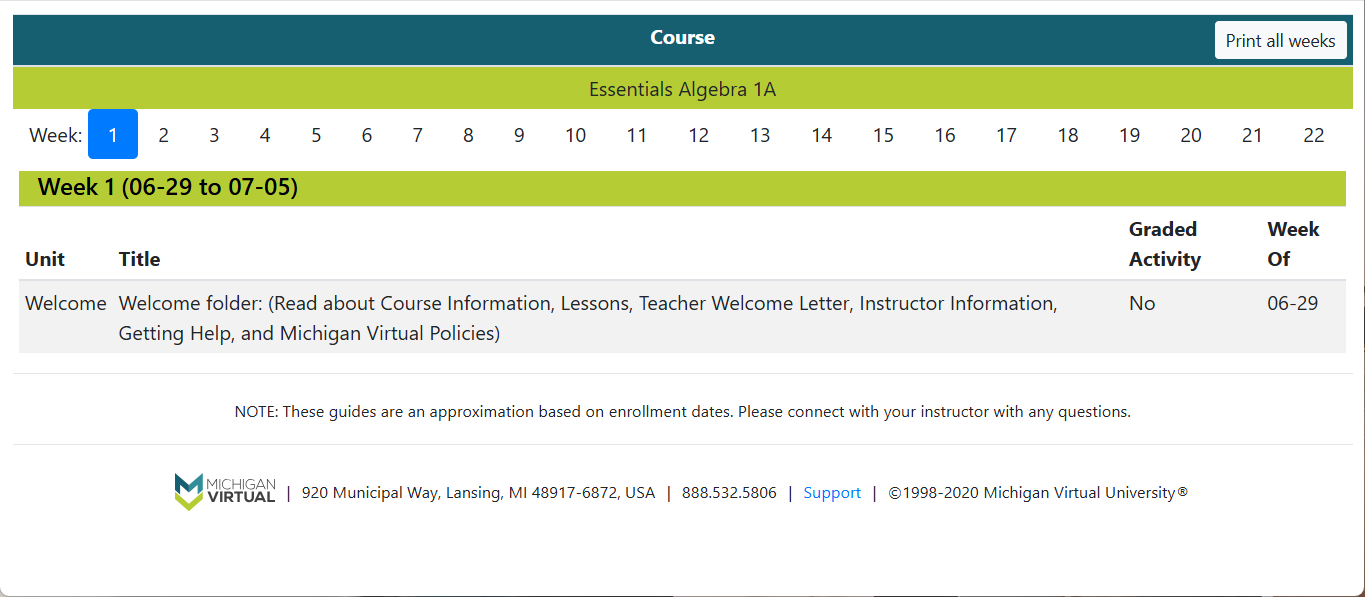 - As a result, a new tab will open to display the current weeks assignments. Each week number will be linked and if selected will display the assignments in a table below. To print a copy of this pacing guide, click the “Print all weeks” button in the upper right corner.