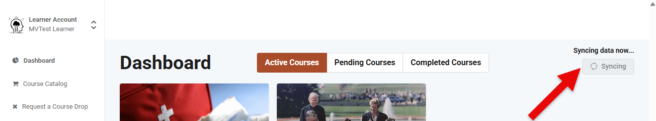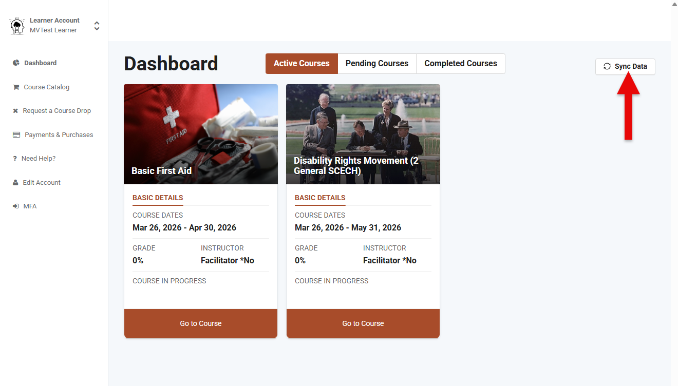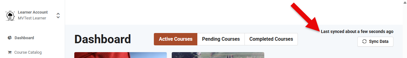 The Sync Data feature allows learners to manually update their information with the LMS. This ensures that recent activity, such as course completions, is accurately reflected. The feature also displays the date and time of the most recent sync, providing visibility into when data was last updated.