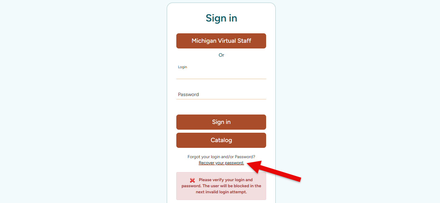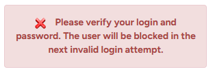 Error Message: “Please verify your login and password. The user will be blocked in the next invalid login attempt.”