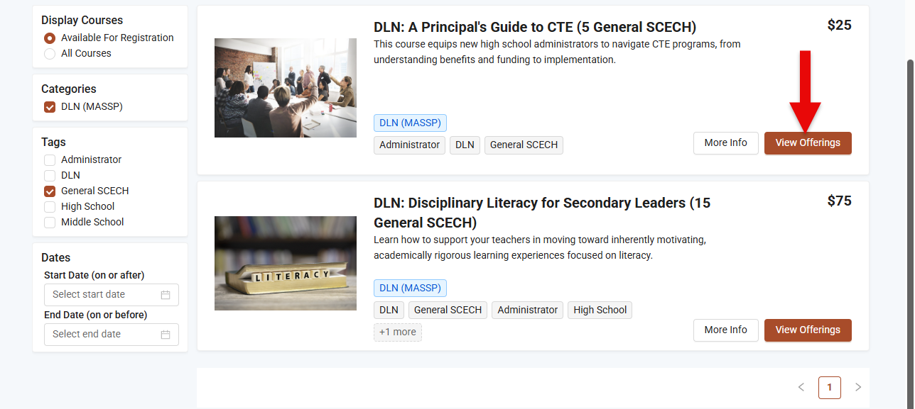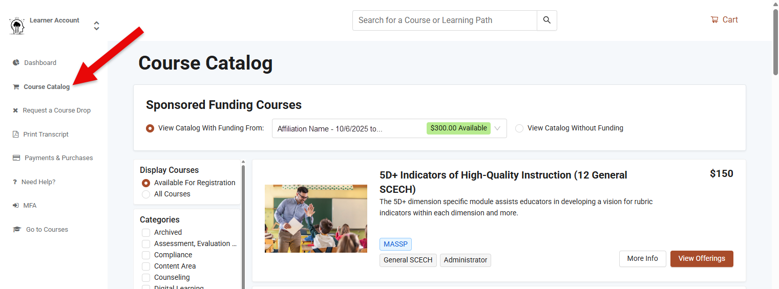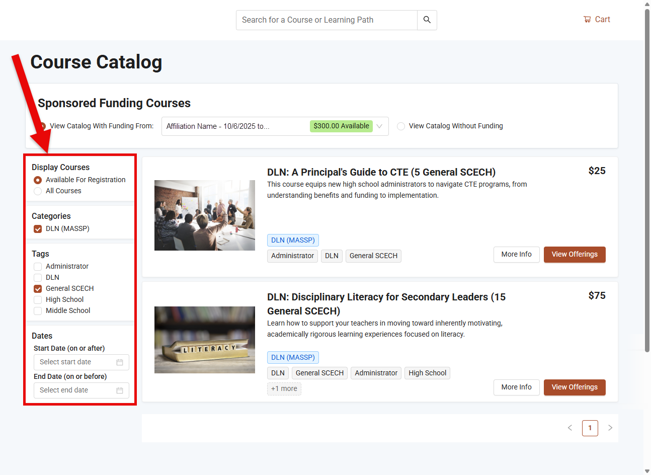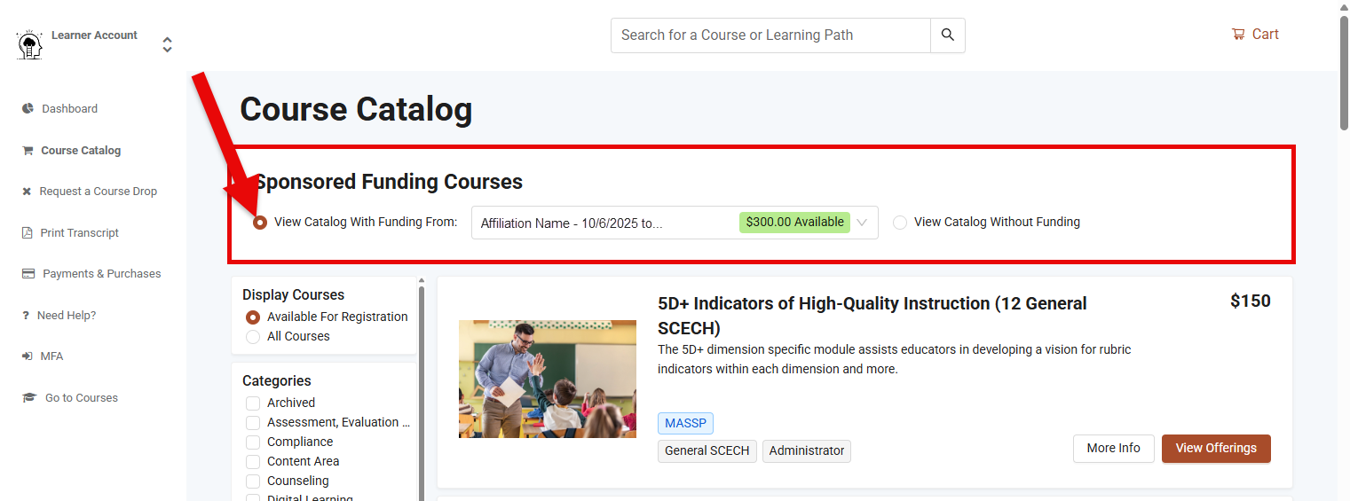 Note: The "Sponsored Funding Courses" section will only be displayed for Shared Time Program learners and learners whose districts offer a GRE (Group Registration and Enrollment) Choice. If the Learner created a personal account that isn't linked to the district's professional group, they should contact Customer Care to have their accounts merged. - With the above selected, learners will narrow displayed results using the filters to the left. As filters are applied, the list of courses will update to reflect the selections the learner makes.