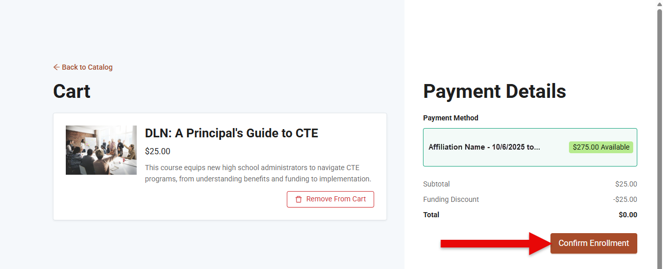 - At this point, the learner will navigate to the cart and then select Confirm Enrollment. Courses will then be available on the learner's Dashboard.